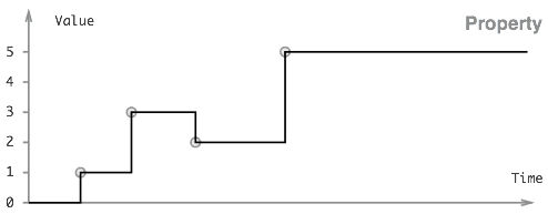 Properties represent values that change over time. The value of a property changes in response to events, which means that any stream may be easily converted into a property.
